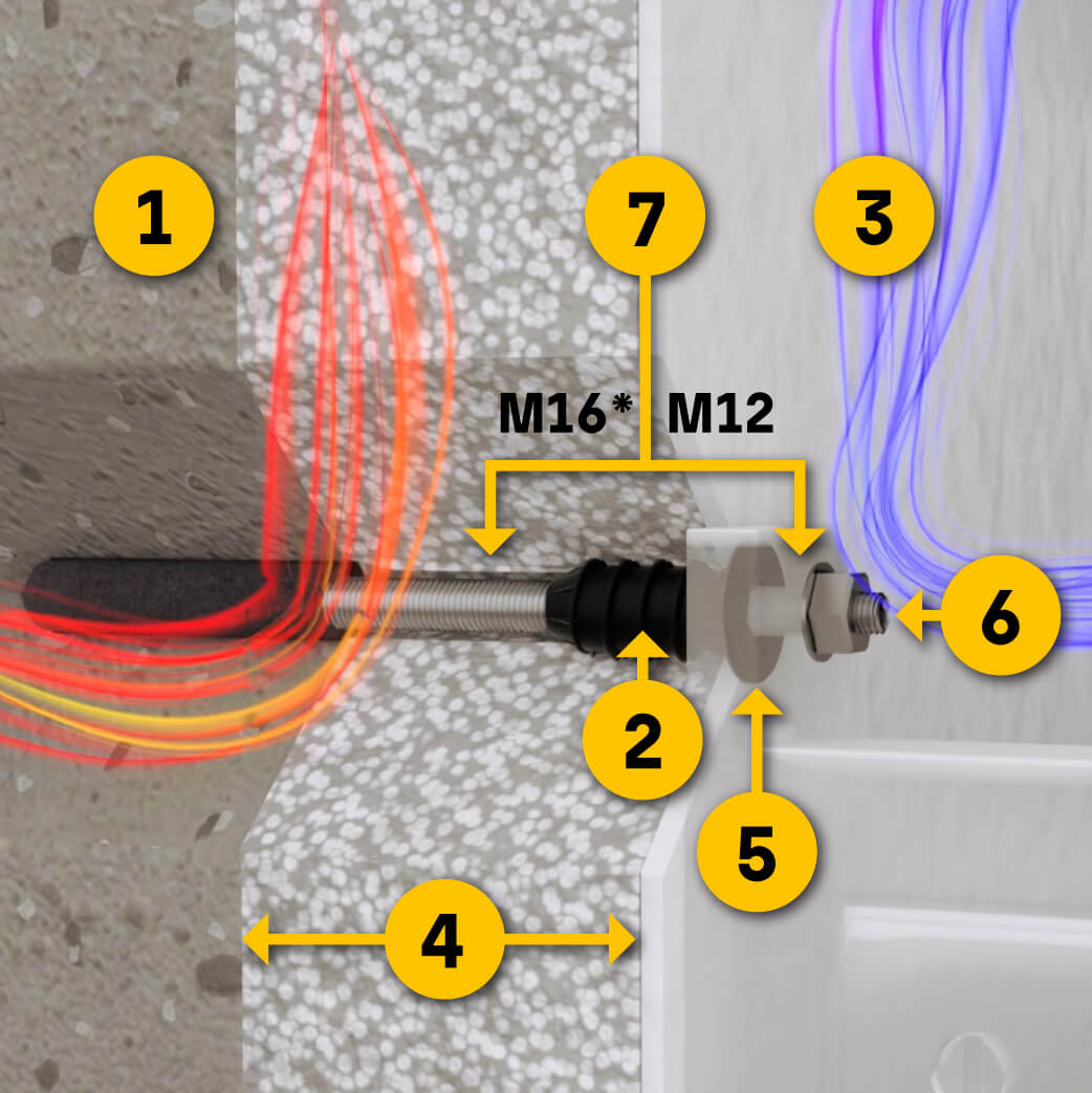 While the external metal parts are always made of A4 stainless steel, the threaded rod located in the insulation and wall differs for the two variants. It is available in zinc plated or A4 stainless steel.