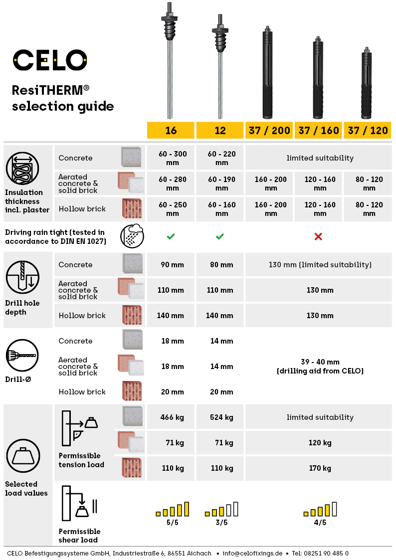 For further details and load values, please refer to the technical data sheet ResiTHERM® 16 & 12: